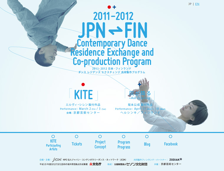 KITE JPN - FIN Contemporary Dance Residence Exchange and Co-production Program Information 「KITE」2011-2012 日本—フィンランド ダンス レジデンス エクスチェンジ 共同製作プログラム 2011 日本とフィンランドの振付家が、お互い相手の地で現地のダンサーとともに作品を創り上げていくダンスプログラムのサイトの制作を担当しました。 http://jf2012.jcdn.org #Web Back